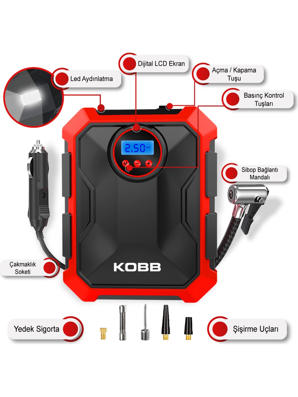· KOBB KB200 12Volt 150 PSI Ayarlanabilir Dijital Basınç Göstergeli Hava Lastik Şişirme Pompası