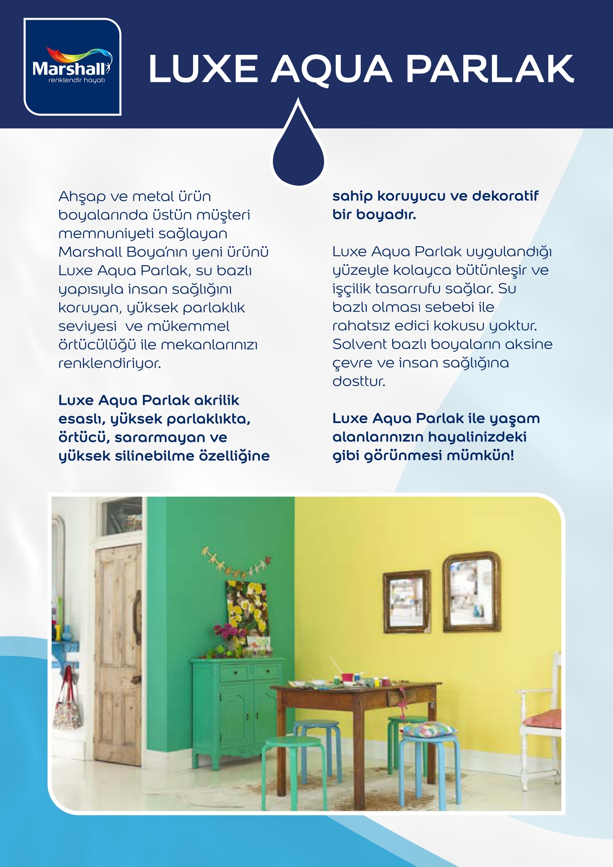 Luxe Aqua Parlak Marshall’ın uzun yıllar öncesine dayanan derin teknoloji ve bilgi birikimi ile özel olarak geliştirdiği su bazlı mükemmel parlak bir boyadır. Duvarlarınızın yanında ahşap, metal,kapı gibi farklı alanları renklendirerek çok amaçlı fayda sağlar. Su bazlı yapısı ile uygulama esnasında rahatsız edici kokuya maruz kalmazsınız. Silinebilme özelliği ile özellikle çocuklu evler için büyük kolaylık sağlar. Defalarca silinse ilk günkü rengini ve dokusunu korumaya devam eder.