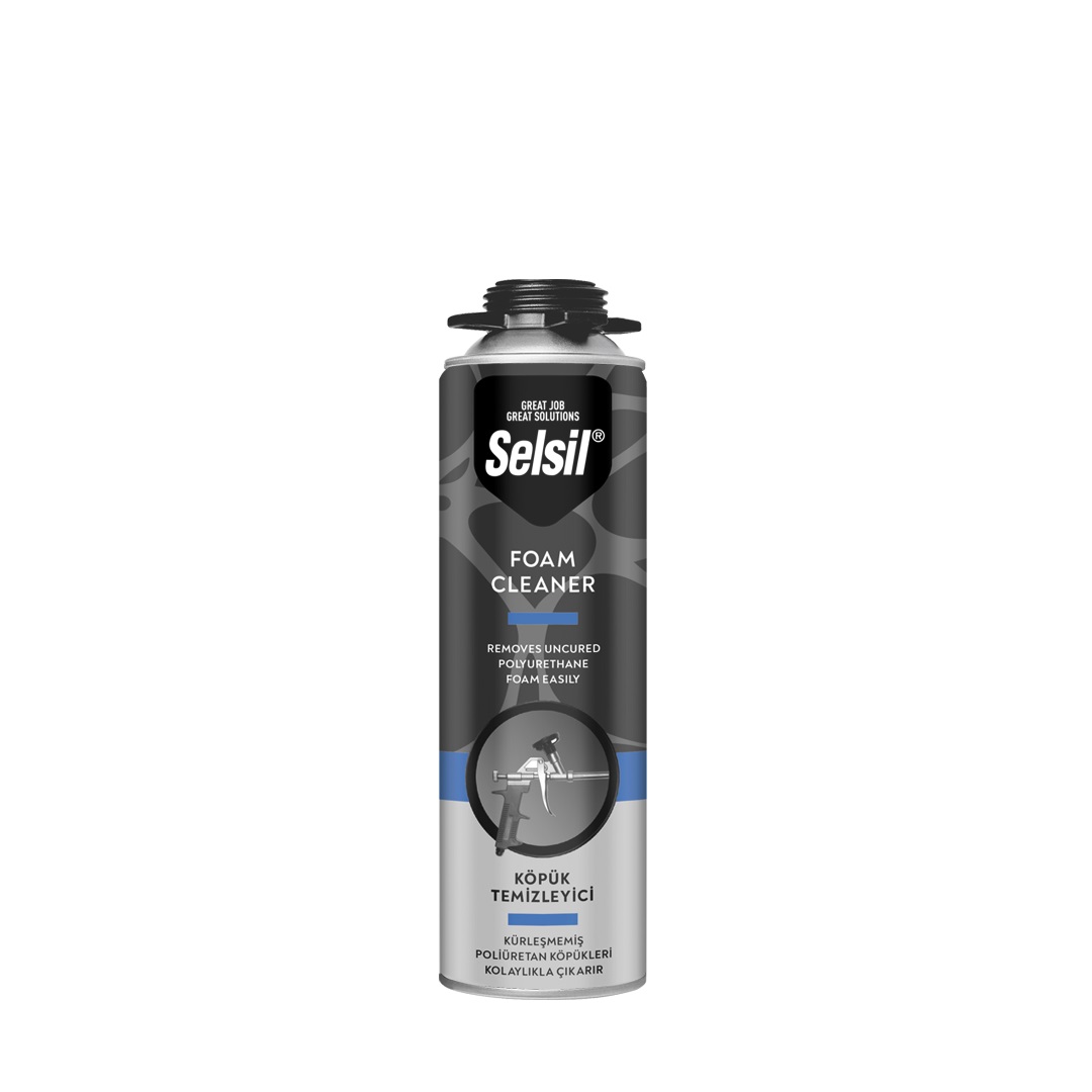Selsil Köpük Temizleyici, kullanım sonrası püskürtme tabancalarından taze poliüretan köpükleri çıkaran bir temizleyicidir. Yüzeyleri, giysileri, kapı ve pencere pervazlarını temizler ve püskürtme tabancalarının içinde sertleşmeyi önler.